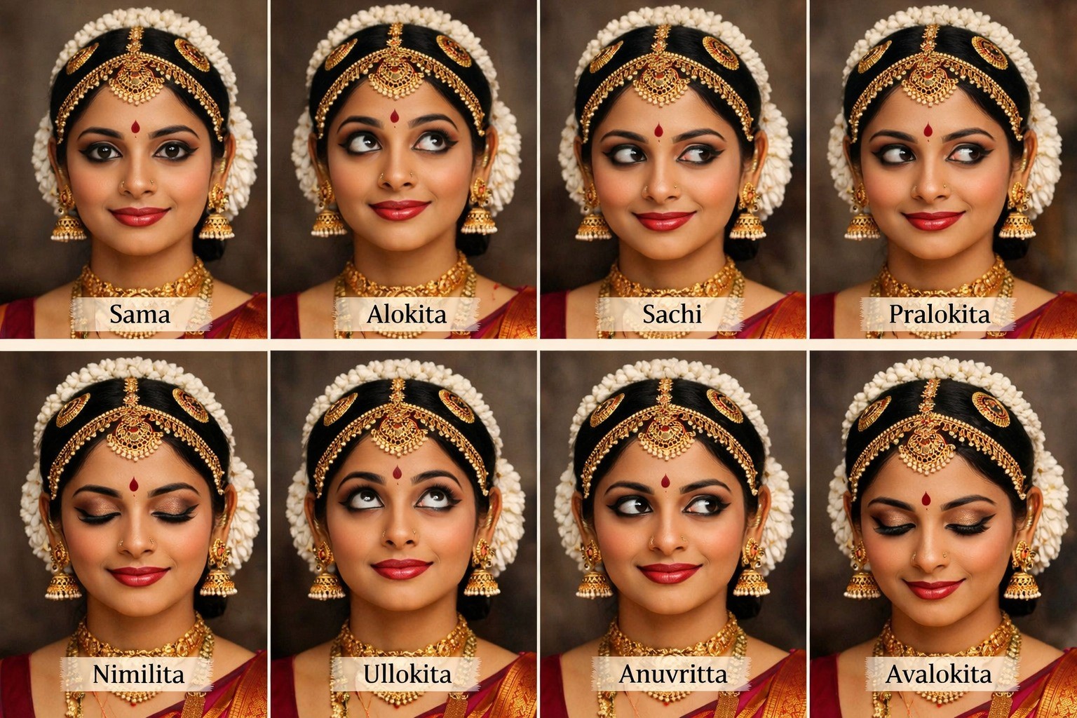 Dristibhedah means the classification of eye movements. In Bharatanatyam, it belongs to Angika Abhinaya, the expressive use of the body. The Abhinayadarpanam lists eight eye movements, each with a distinct form and purpose in performance.